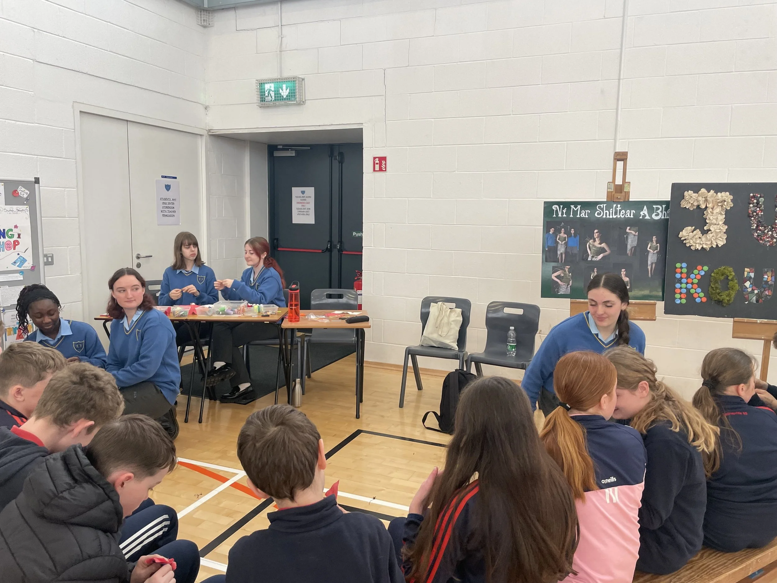 Our Transition Year students who entered Junk Kouture also displayed their projects to showcase how you can upcycle waste. As well as this, primary school students had the opportunity to practice their sewing skills with a group of TY students who have entered the Young Environmentalist Awards Competition, students firstly showed students what to do and then the primary school students had to apply what they learned and try to sew a patch onto a piece of fabric. As well as this students had the opportunity to walk around and engage with 12 BTYS Projects.